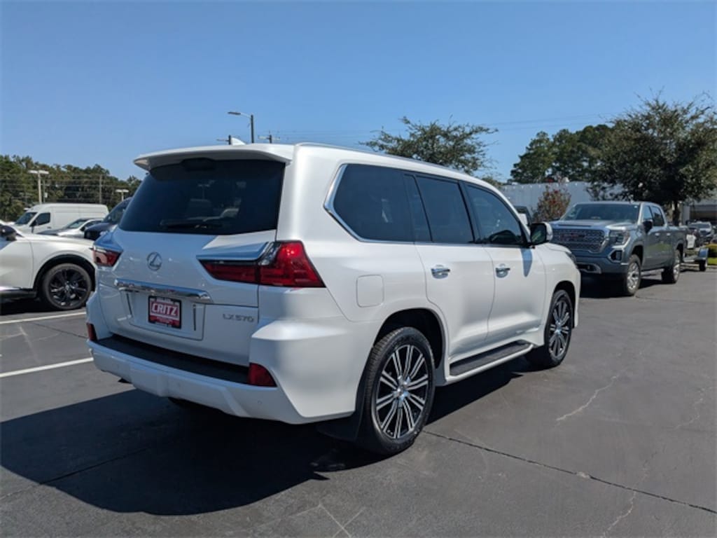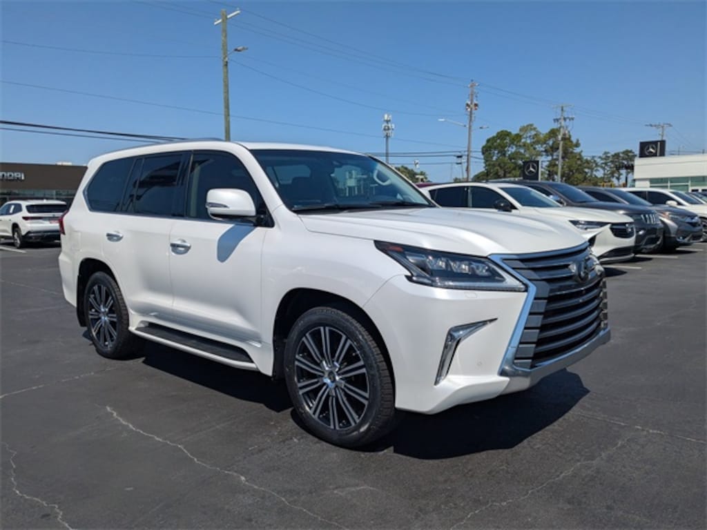 Clean CARFAX. CARFAX One-Owner. White 2021 Lexus LX 570 4WD 8-Speed Automatic with Sequential Shift 5.7L V8 DOHC Dual VVT-i 32V APPLE CAR PLAY, ANDROID AUTO, USB PORTS, BLUETOOTH, Black w/Leather Seat Trim or Semi-Aniline Leather Seat Trim, Accessory Package (Z1), Alloy Wheel Locks, Cargo Net, Carpet Cargo Mat, Front & Rear LED Courtesy Lamps w/Logo, Heated/Ventilated Front & 2nd Row Outboard Seats, Key Gloves, Luxury Package, Navigation System, Seat Air Conditioner, Semi-Aniline Leather Seat Trim, Tonneau Cover, Two Row Package.