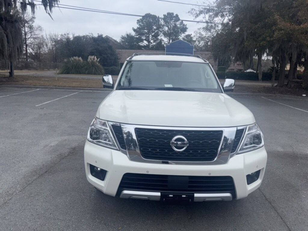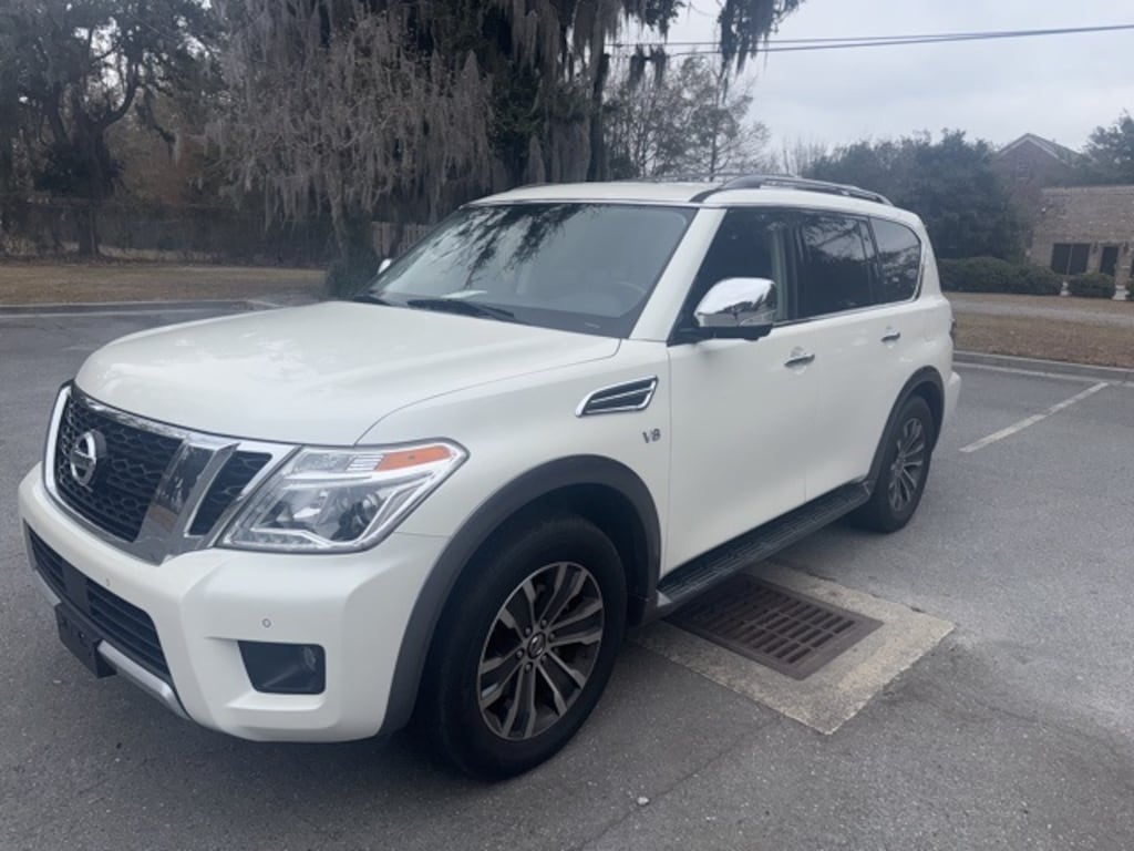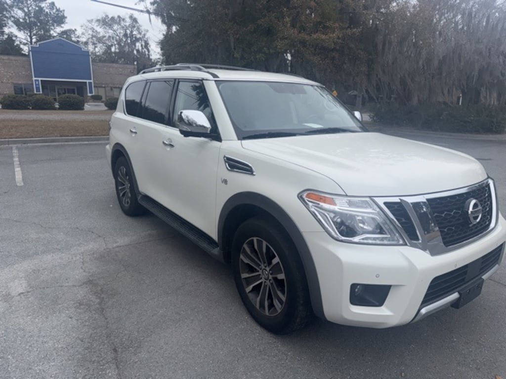 Clean CARFAX. Recent Arrival! Pearl White 2018 Nissan Armada SL RWD 7-Speed Automatic 5.6L V8 DOHC 32V Endurance USB PORTS, BLUETOOTH, 2.937 Axle Ratio, Alloy wheels, Automatic Emergency Braking (AEB), Blind Spot Warning, Intelligent Back-Up Intervention (I-BI), Intelligent Cruise Control w/Full-Spd Range (ICC), Intelligent Distance Control (I-DC), Intelligent Forward Collision Warning (I-FCW), Navigation System, Power Sliding Moonroof w/Front Tilt & Rear Slide, Premium Package, Wheels: 20" Machined Finish Painted Alloy.
